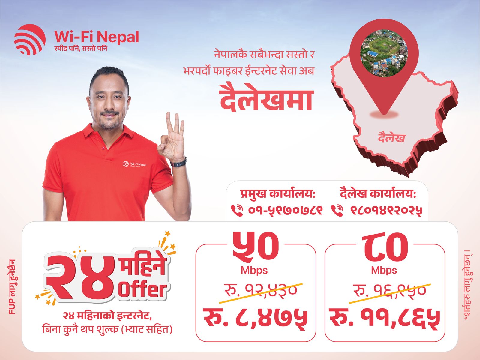 सुर्खेत । नेपालकै सबैभन्दा सस्तो इन्टरनेट सेवा प्रदान गर्दै आइरहेको वाइ फाई नेपालले दैलेखमा पनि सेवा विस्तार गरेको छ । सेवा विस्तार गरेसँगै अब दैलेखमा पनि २४ महिने अफर अन्तर्गत अब प्रतिमहिना करिब २ सय ७० रुपैयाँमा वाइ९फाइ नेपालको इन्टरनेट जडान गर्न सकिने भएको हो ।
