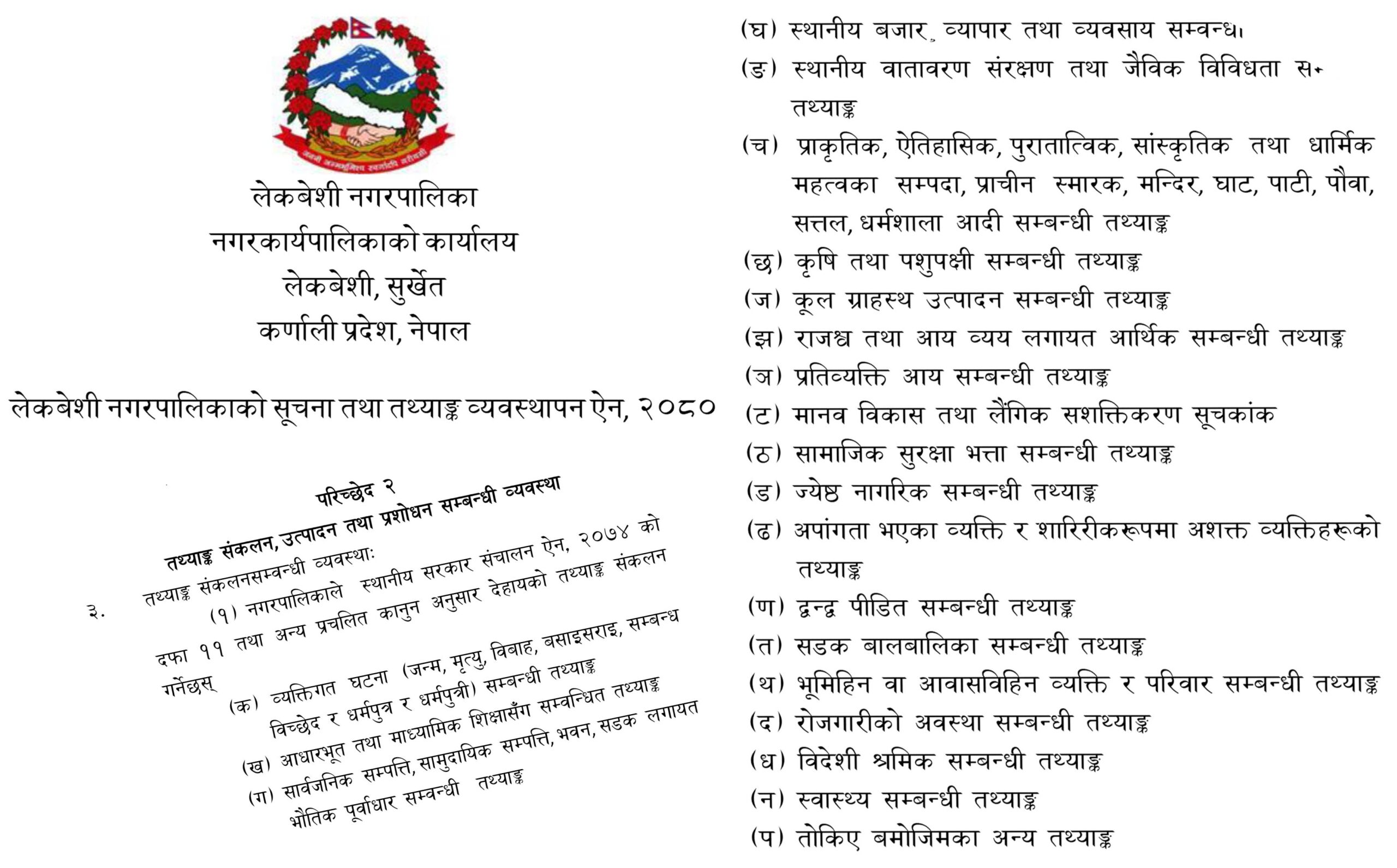 आर्थिक वर्ष २०७९÷८० देखि यहाँ एकिकृत तथ्याङ्क व्यवस्थापन प्रणाली लागू भएको हो । कर्णाली प्रदेशमा यो प्रणाली लागू गर्ने लेकवेशी नगरपालिका नै पहिलो बनेको छ । नगरपालिकाले तथ्याङ्कको सही प्रयोगका लागि सूचना तथा तथ्याङ्क व्यवस्थापन ऐन, २०८० लागू गरिसकेको छ ।