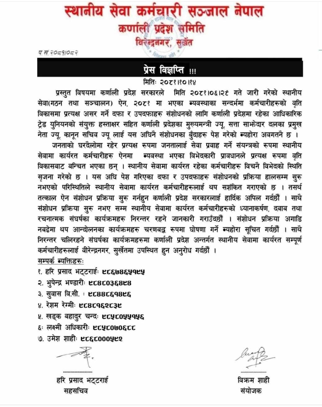 दवावका लागि हाल जारी रहेका संघर्षका कार्यक्रमहरुमा सहभागी हुन समितिले प्रदेशका ७९ वटै स्थानीय तहमा कार्यरत कर्मचारीलाई वीरेन्द्रनगरमा उपस्थित हुन अनुरोध गरिएको शाहीले जनाए ।