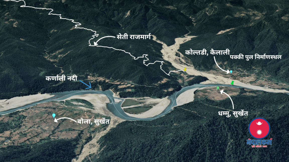 कैलाली र सुर्खेत जोड्ने पुल निर्माणको काम अहिले भइरहेको मोहन्याल गाउँपालिकाका उपाध्यक्ष कमलबहादुर साउँदले नेपालकर्मलाई जानकारी दिए ।