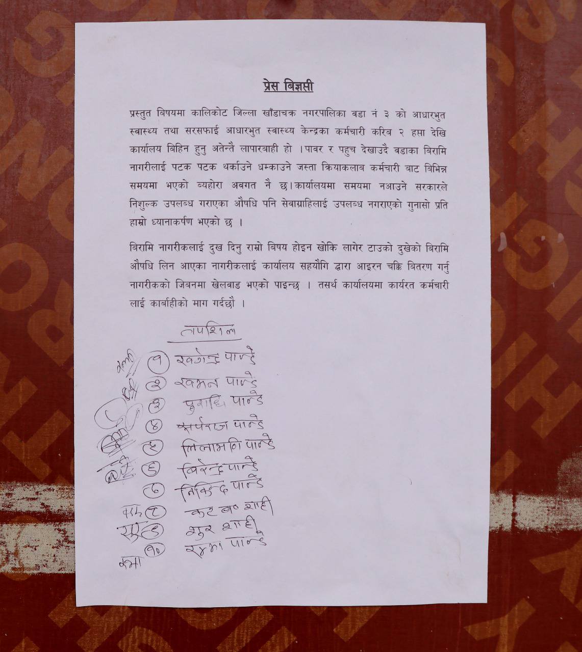 वीरेन्द्रनगर । कालिकोट जिल्लाको सदरमुकाममा रहेको खाँडाचक्र नगरपालिका–३ को आधारभुत स्वास्थ्य केन्द्रमा स्थानीयले ताला लगाएका छन् । आधारभुत स्वास्थ्य केन्द्रका कर्मचारी करिब दुई हप्तादेखि कार्यालय बिहिन भएका छन् ।