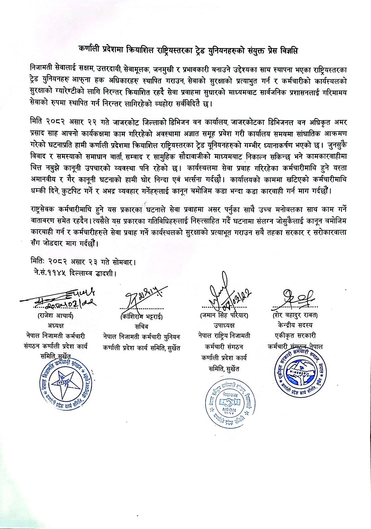 नेपाल निजामती कर्मचारी संगठन, नेपाल राष्ट्रिय निजामति कर्मचारी संगठन र नेपाल निजामति कर्मचारी युनियन कर्णाली प्रदेश कार्यसमितिले संयुक्त रुपमा विज्ञप्ती जारी गर्दै भनिएको छ, ‘कार्यकक्षमा काम गरिरहेको अवस्थामा अज्ञात समूह प्रवेश गरी कार्यालय समयमा सांघातिक आक्रमण गरेको घटनाप्रति दुःख व्यक्त गर्दछौं ।’