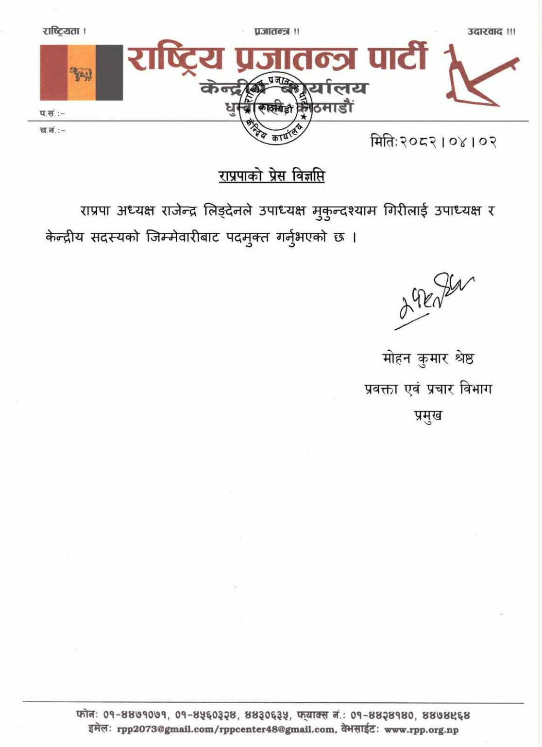 पदबाट हटाउनुका कारणबारे कुनै उल्लेख नगरे पनि अध्यक्ष लिङ्देनका निर्देशनमा हटाइएको राप्रपाका प्रवक्ता तथा प्रचार विभागका प्रमुख मोहनकुमार श्रेष्ठले जारी गरेको विज्ञप्तीमा उल्लेख छ ।