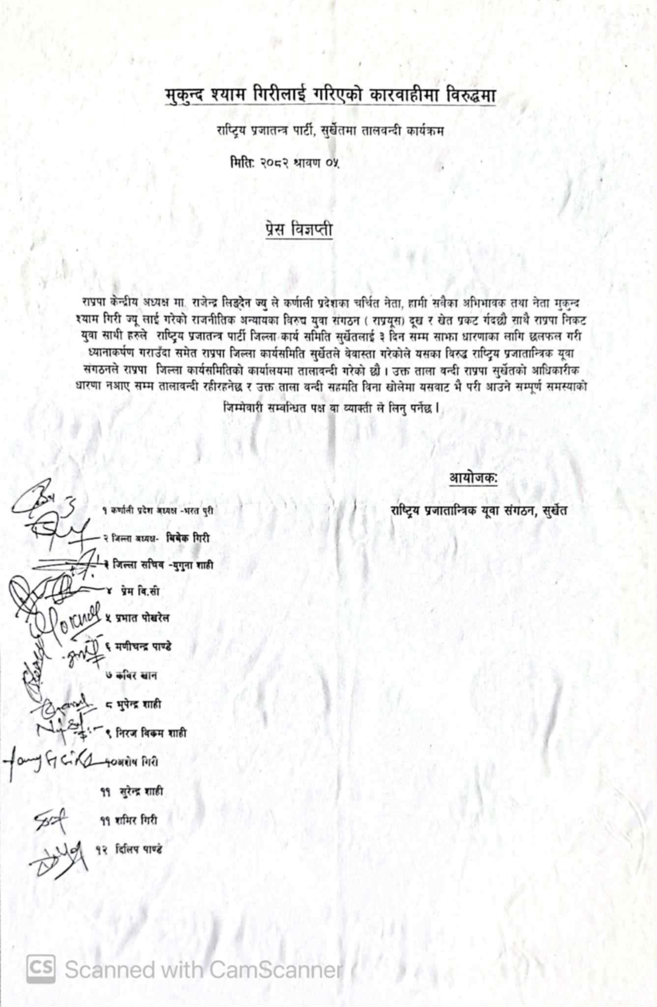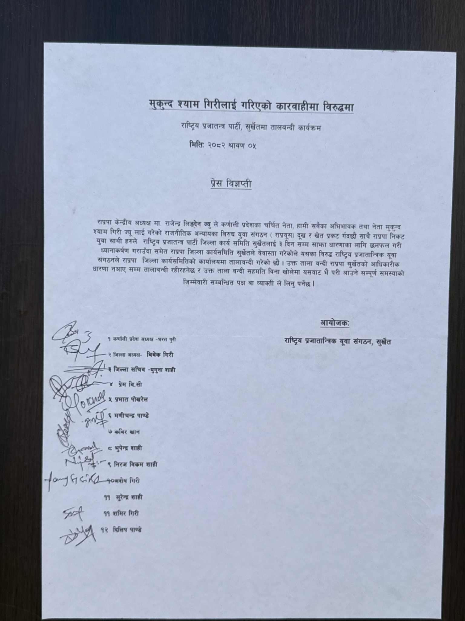 उपाध्यक्ष गिरीमाथिको कारबाहीलाई लिएर राप्रपा सुर्खेतले आधिकारिक धारणा सार्वजनिक नगरेसम्म तालाबन्दी गरिने राष्ट्रिय प्रजातान्त्रिक युवा संगठन सुर्खेतले निकालेको विज्ञप्तिमा उल्लेख छ ।