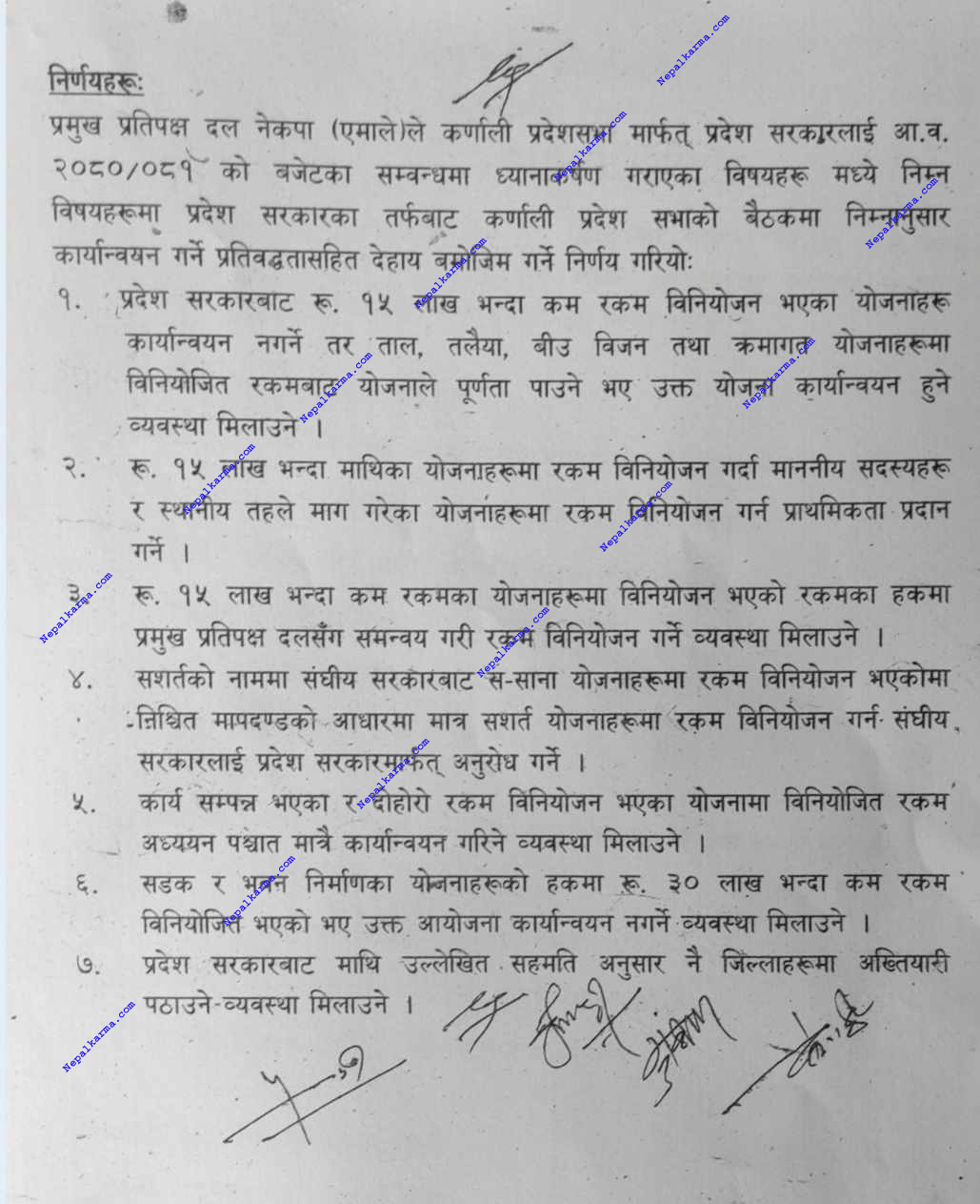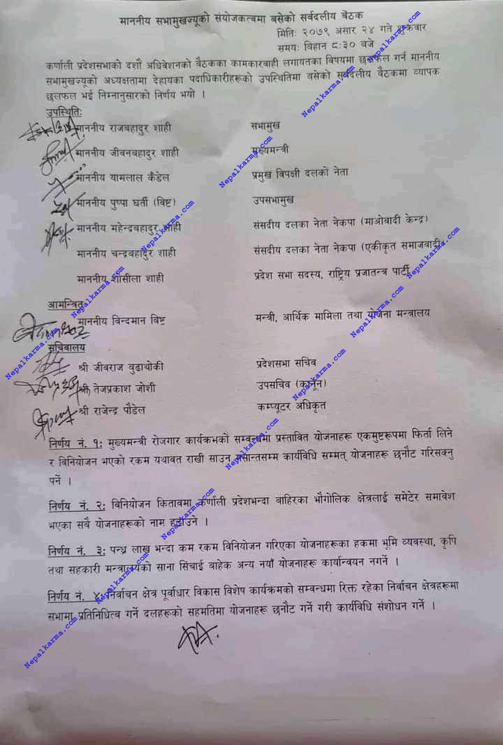 उक्त बुँदामा भएको निर्णयमा कर्णाली सरकारले एमालेको औकात देखाएको छ। पहिलो बुँदामा १५ लाख भन्दा कम रकमका योजना कार्यान्वयन नगर्ने भने पनि यदी गर्नुनै पर्ने भए एमालेसँग समन्वय गर्नुपर्ने निर्णयले यो एक लाज छोप्ने टालो जस्तो बनेको मात्रै देखिन्छ।