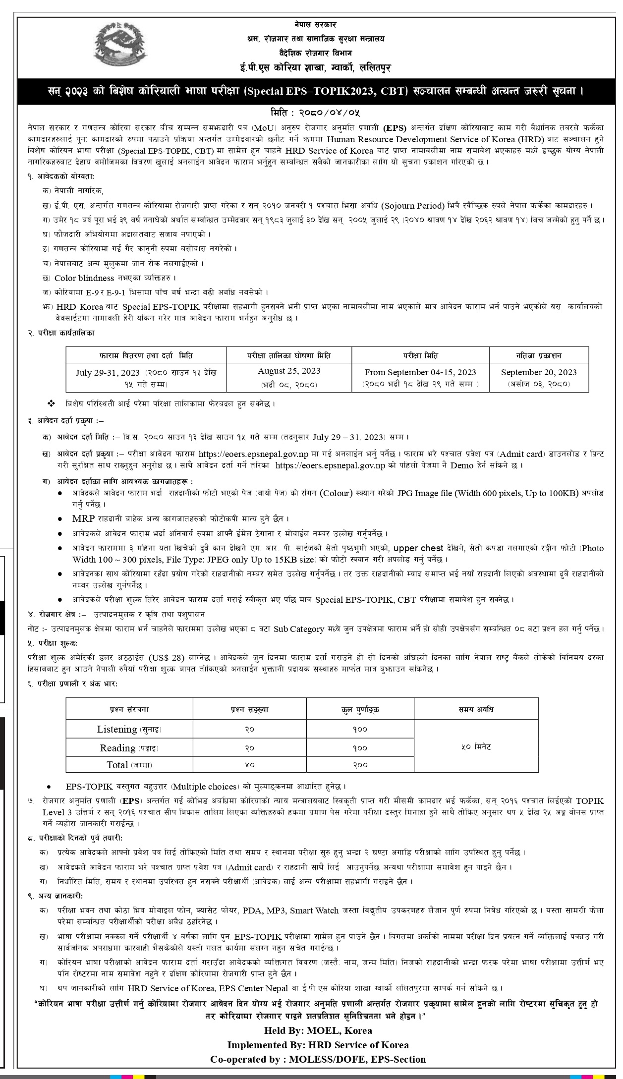 कोरियामा इ–९ र ३–९–१ भिसामा पाँच वर्ष भन्दा बढी अवधि नबसेका र कोरियाको मानव संशाधान विभाग बाट इपिएस भाषा परीक्षामा सहभागी हुन सक्ने भनेर नामावलीमा नाम भएकाले फारम पर्न पाउने पनि शाखाले जानकारी दिएको छ।