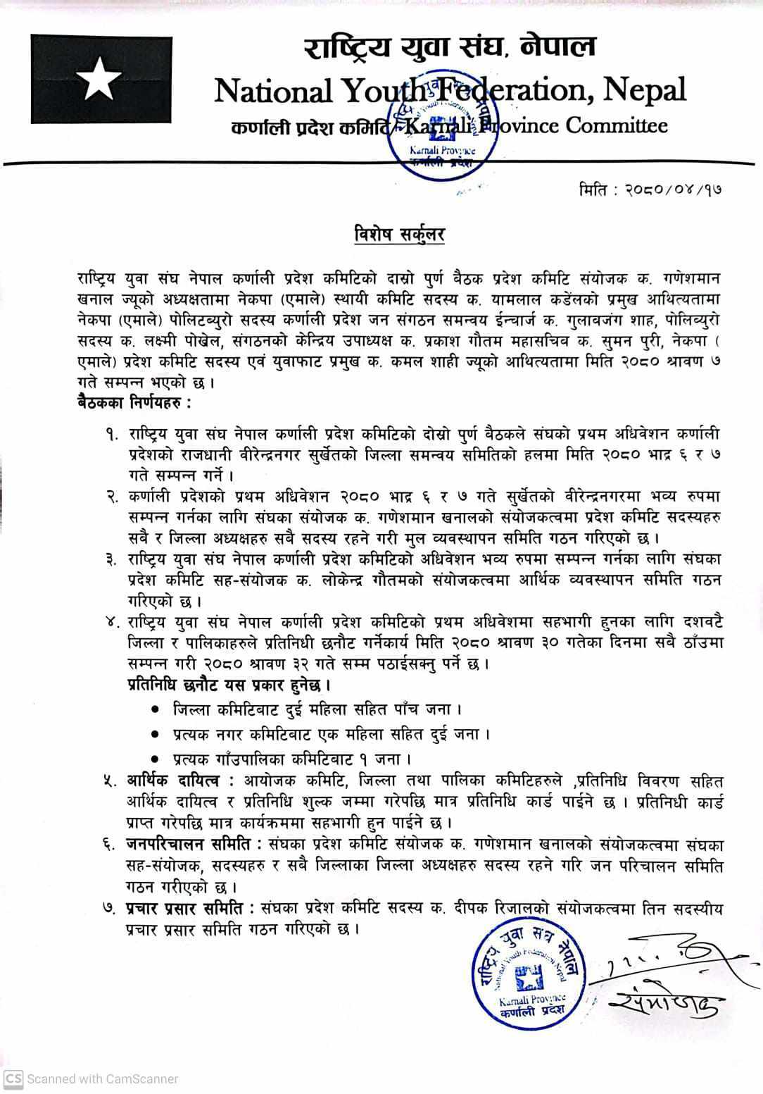 बैठकले कणाृली प्रदेशका १० वटै जिल्ला र पालिकाहरुले साउन ३० गते भित्र अधिवेशनमा सहभागी हुने प्रतिनिधिहरु छनौट गरिसक्नु पर्ने, प्रत्येक जिल्ला कमिटीबाट २ महिलासहित ५ जना, नगर कमिटीबाट १ महिलासहित २ जना र गाउँ कमिटीबाट १ जना प्रतिनिधि सहभागी हुन पाउने निर्णय भएको छ।