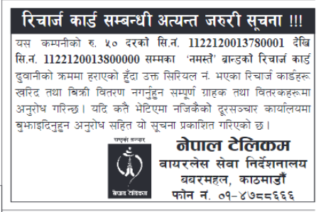 टेलिकमका अनुसार सि. नं. ११२२१२००१३७८०००१ देखि ११२२१२००१३८००००० सम्मको रिचार्ज कार्ड हराएको बताएको छ। ती कार्ड खरिद नगर्न समेत टेलिकमले अनुरोध गरेको छ।