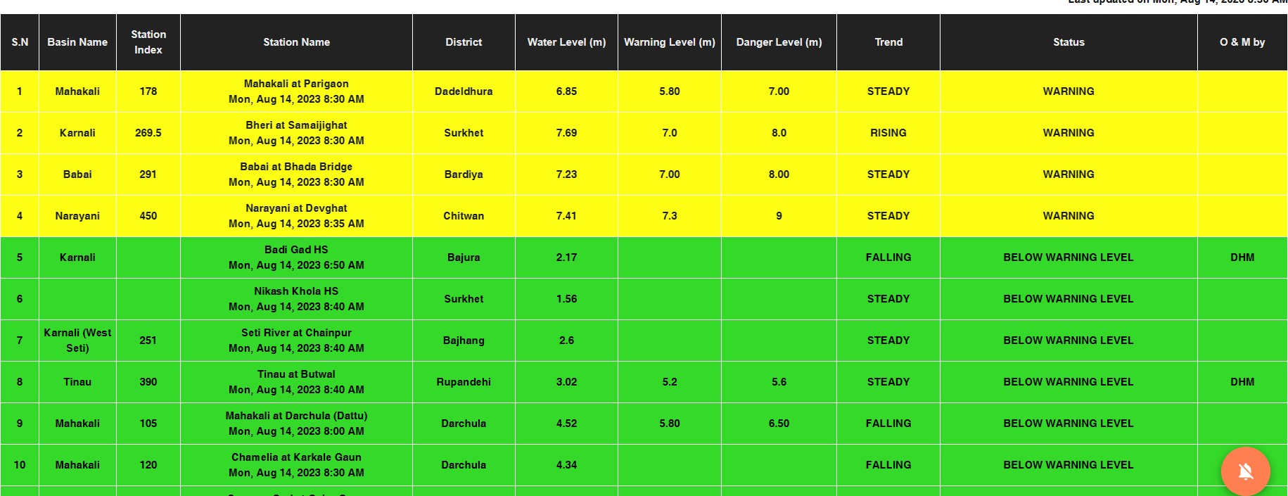 अहिले भेरी नदीमा बाढीको बहाव ७.६९ मिटर पुगेपछि महाशाखाले चेतावनी जारी गरेको छ । भेरी नदीमा ७ मिटर बाढी आएमा चेतावनी र ८ मिटर पुगे खतरा मानिन्छ ।