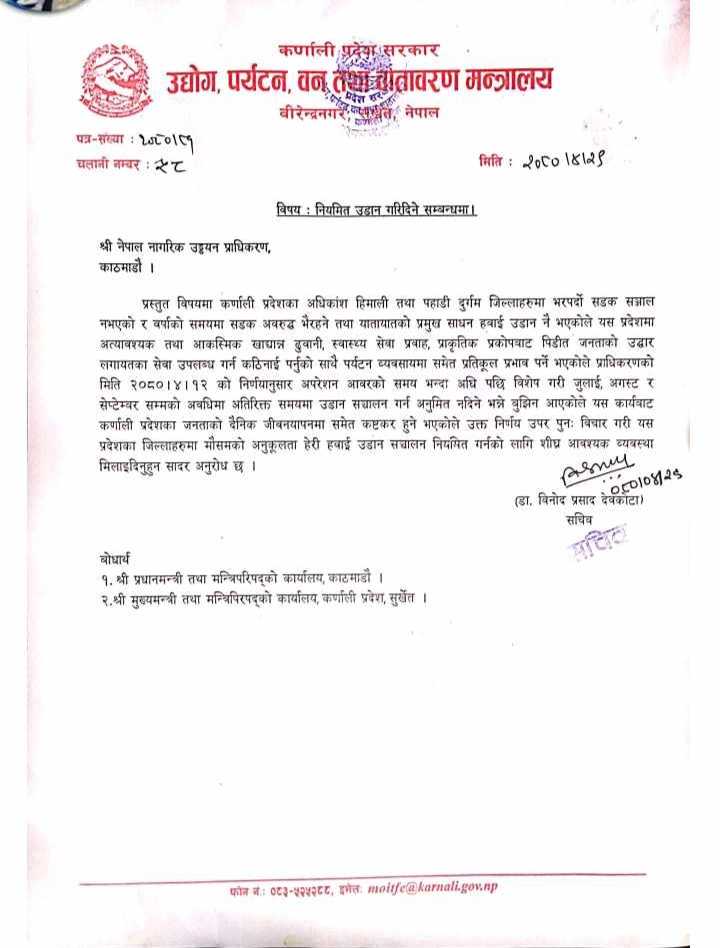 प्रदेशको उद्योग, पर्यटन, वन तथा वातावरण मन्त्रालयले एक विज्ञप्ती जारी गर्दै जहाज नउडाउने निर्णयले कर्णालीका जनताहरुको दैनिक जीवनस्तर थप कठिनाई भएकाले मौसमको प्रतिकुलता हेरेर हवाई उडान नियमित गर्न माग गरिएको हो ।