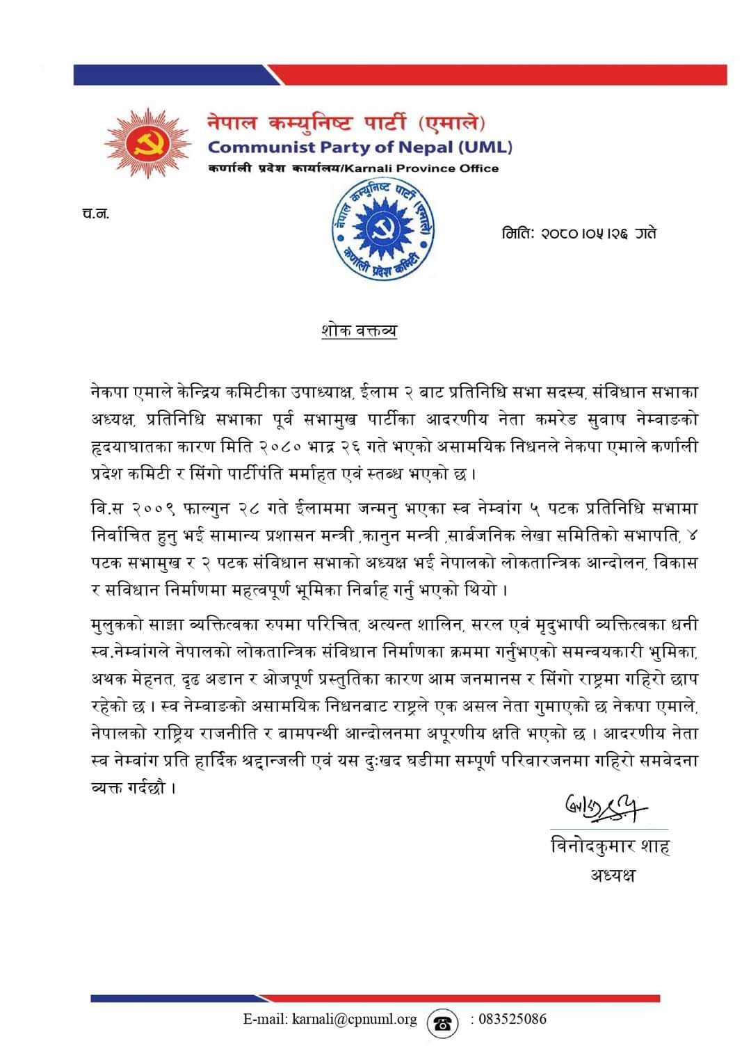सुर्खेत । नेकपा एमालेका उपाध्यक्ष एवम् संविधान सभाका अध्यक्ष तथा पूर्वसभामुख सुवास चन्द्र नेम्वाङप्रति एमाले कर्णालीले शोक व्यक्त गरेको छ। एमाले कर्णाली प्रदेश कमिटी अध्यक्ष विनोदकुमार शाहले एक वक्तत्व जारी गर्दै शोक व्यक्त गरेका हुन्।