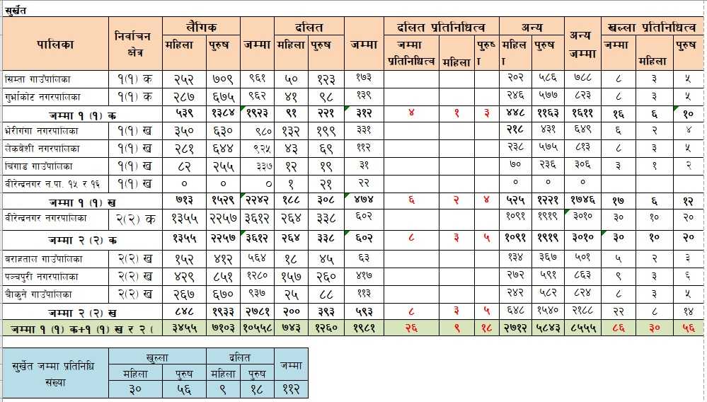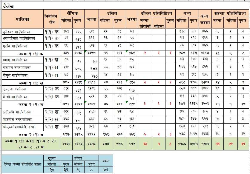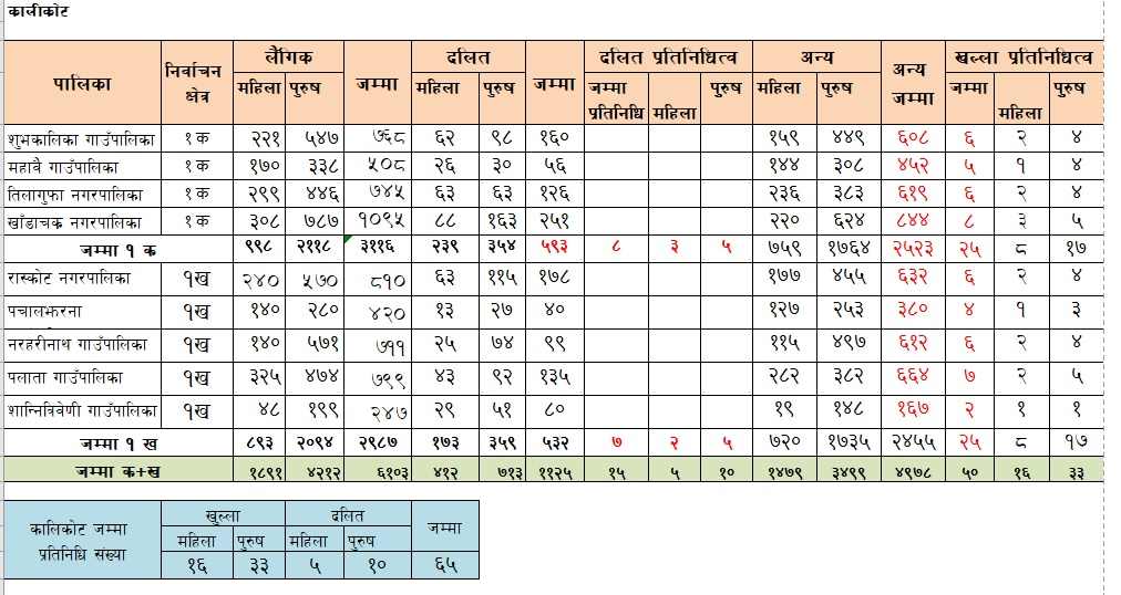 यस्तै, ६ हजार १०३ पार्टी सदस्य रहेको कालीकोटबाट ६५ जना प्रतिनिधि छानिनेछन्। जसमा १६ महिला, ३३ पुरुष खुल्लाबाट र दलिततर्फबाट पाँच महिला र १० पुरुष प्रतिनिधि हुन पाउँनेछन्। ६ हजार ६५३ संगठित सदस्य रहेको दैलेखबाट खुल्लातर्फ २० महिला तथा ३९ पुरुष प्रतिनिधि चयन हुनेछन् भने दलिततर्फ पाँच महिला र आठ पुरुष गरी ७२ जना चयन हुँदैछन्।