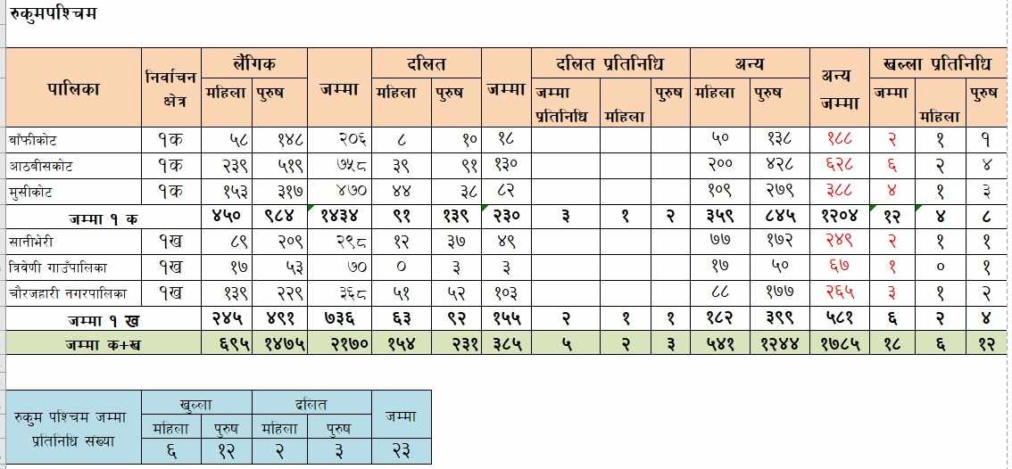 यस्तै, तीन हजार ५८८ पार्टी सदस्य रहेको सलयानमा ३८ जना प्रतिनिधि सहभागि हुनेछन्। जसमा महिलातर्फ आठ, पुरुषतर्फ २२ र दलिततर्फ महिला दुई र पुरुष ६ जना छन्। दुई हजार १७० संगठित सदस्य रहेको रुकुमपश्चिमा २३ जना प्रतिनिधि चयन हुनेछन्। जसमा खुलतर्फ महिला ६, पुरुष १२ र दलिततर्फ महिला २ र पुरुष ३ चयन हुने छन्।