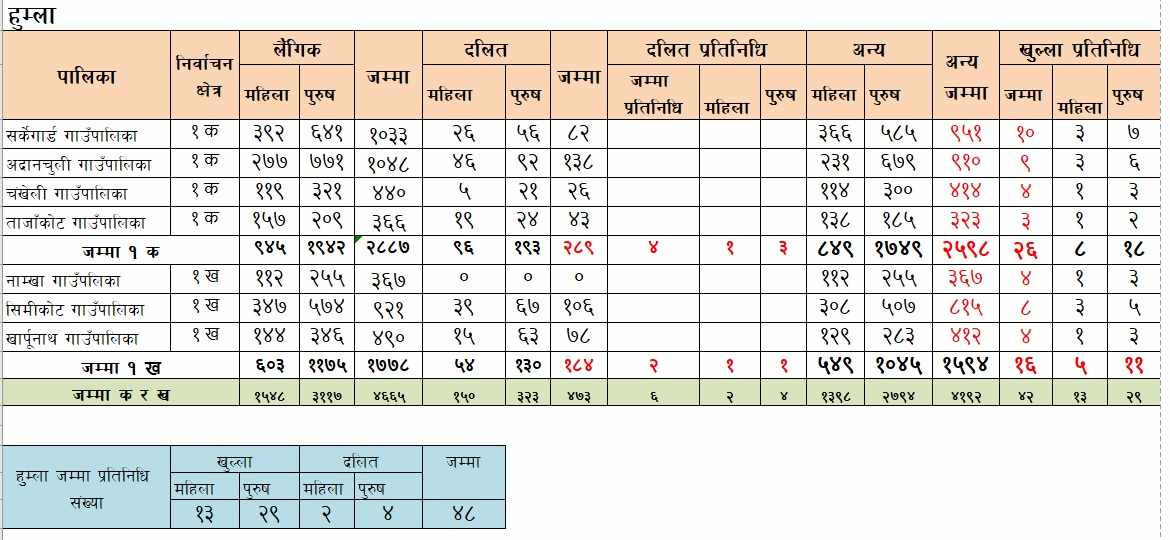 हुम्लाबाट ४८ जना प्रतिनिधि छनौट हुने भएका छन्। चार हजार ६६५ जना संगठित सदस्य रहेको हुम्लामा १३ महिला २९ पुरुष खुल्लातर्फ र दलिततर्फबाट दुई महिला र चार पुरुष छन्। चार हजार ४४३ जना संगठित सदस्य संख्या रहेको जुम्ला जिल्लाबाट ४६ जना प्रतिनिधि चयन हुनेछन्। जसमा १३ महिला, २५ पुरुष खुल्लाबाट र दलिततर्फबाट दुई महिला र ६ पुरुष छन्।