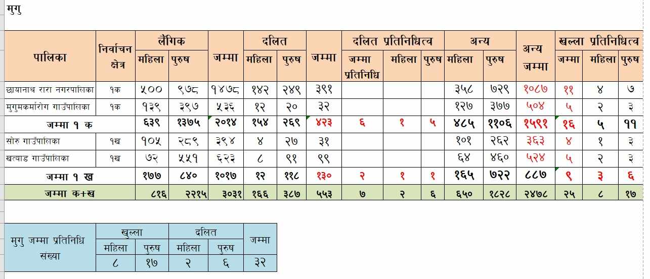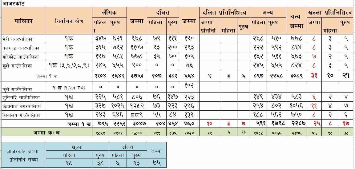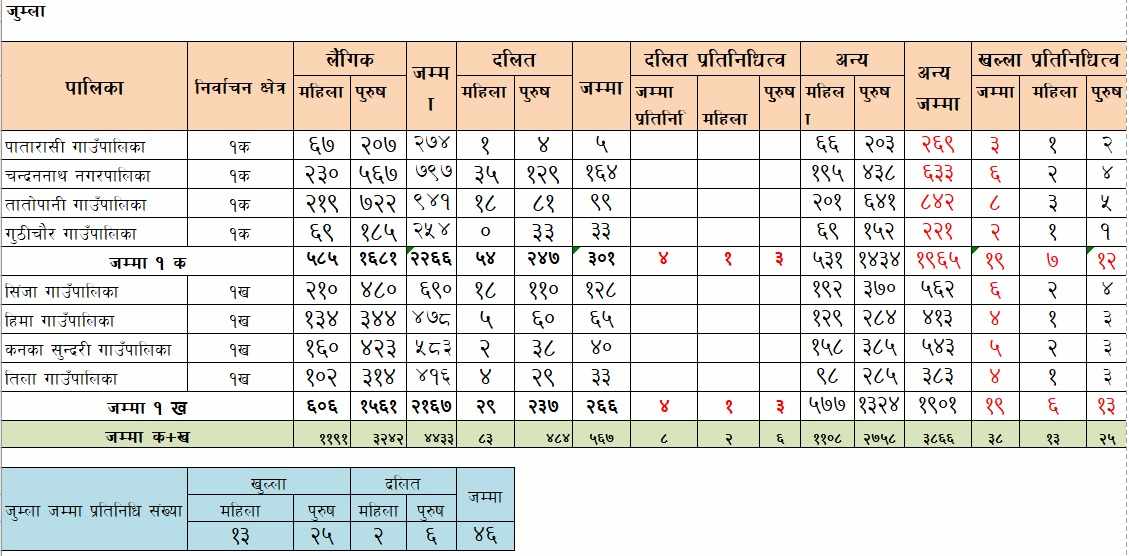६ हजार ८०० पार्टी सदस्य रहेको जाजरकोटबाट ७५ जना प्रतिनिधि चयन हुनेछन्। जसमा खुल्लाबाट महिला १८, पुरुष ३८, दलिततर्फबाट ६ महिला र १३ पुरुष प्रतिनिधि सहभागी हुने छन्। तीन हजार आठ सय ३६ जना संगठित सदस्य रहेको डोल्पाबाट ३९ जना प्रतिनिधि चयन लागेका छन्। जसमा ११ महिला, २३ पुरुष खुल्लाबाट र तीन पुरुष, दुई महिला दलिततर्फ छन्। मुगुमा एमालेका तीन हजार ३१ जना संगठित सदस्यमा ३२ जना प्रतिनिधि चयन हुने छन्। जसमा खुल्ला महिलातर्फ आठ, पुरुषतर्फ १७ जना र दलिततर्फ दुई महिला र ६ पुरुष छन्।