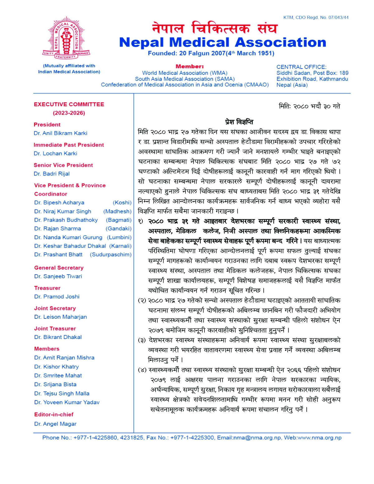 ‘२०८० भाद्र ३१ गते आइतबार देशभरका सम्पूर्ण सरकारी स्वास्थ्य संस्था, अस्पताल, मेडिकल कलेज, निजी अस्पाल तथा क्लिनिकहरुमा आकस्मिक सेवा बाहेकका सम्पूर्ण स्वास्थ्य सेवाहरु पूर्ण रुपमा बन्द गरिने’ संघले जारी गरेको विज्ञप्तिमा भनिएको छ, ‘यस बाध्यात्मक परिस्थितिमा घोषणा गरिएका आन्दोलनलाई पूर्ण रुपमा सफल तुल्याई संघका सम्पुर्ण मागहरुको कार्यान्वयन गराउनका लागि दबाब स्वरुप देशभरका सम्पुर्ण स्वास्थ्य संस्था, अस्पताल तथा मेडिकल कलेजहरु, नेपाल चिकित्सक संघका सम्पुर्ण शाखा कार्यालयहरु, सम्पुर्ण विशेषज्ञ समाजहरुलाई यसै विज्ञप्ति मार्फत यथोचित कार्यान्वयन गर्न गराउन सूचित गरिन्छ।’