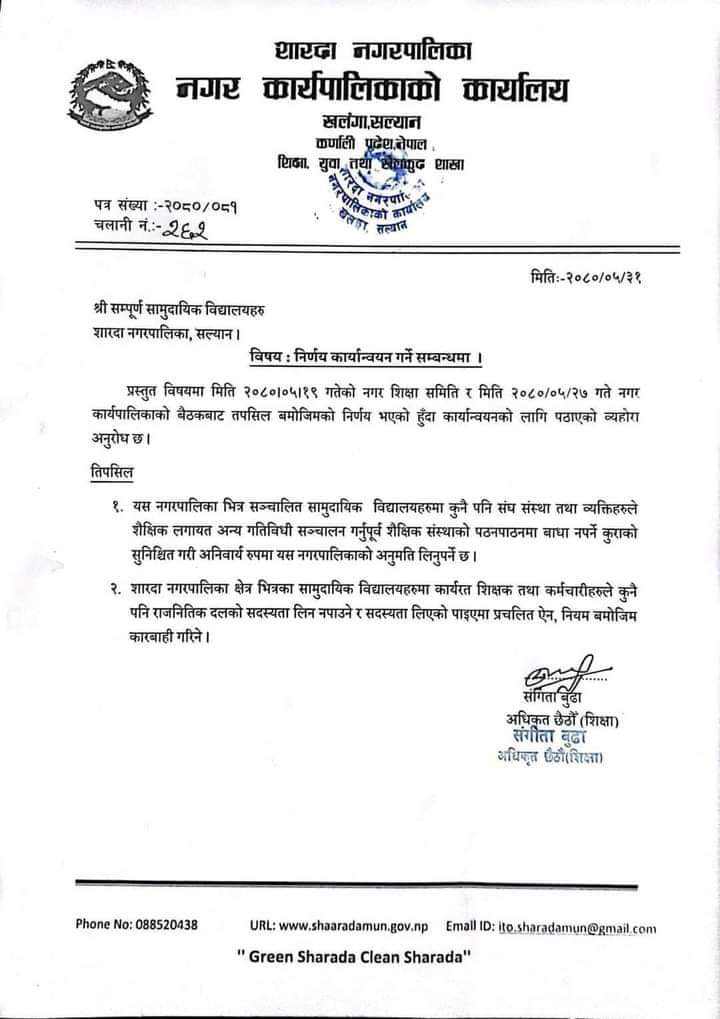 यस्तै शारदा नगरपालिका क्षेत्र भित्रका सामुदायिक विद्यालयहरुमा कार्यरत शिक्षक तथा कर्मचारीहरुले कुनै पनि राजनितिक दलको सदस्यता लिन नपाउने र सदस्यता लिएको पाइएमा प्रचलित ऐन, नियम बमोजिम कारबाही गरिने समेत नगर कार्यपालिकाको बैठकले निर्णय गरेको छ ।