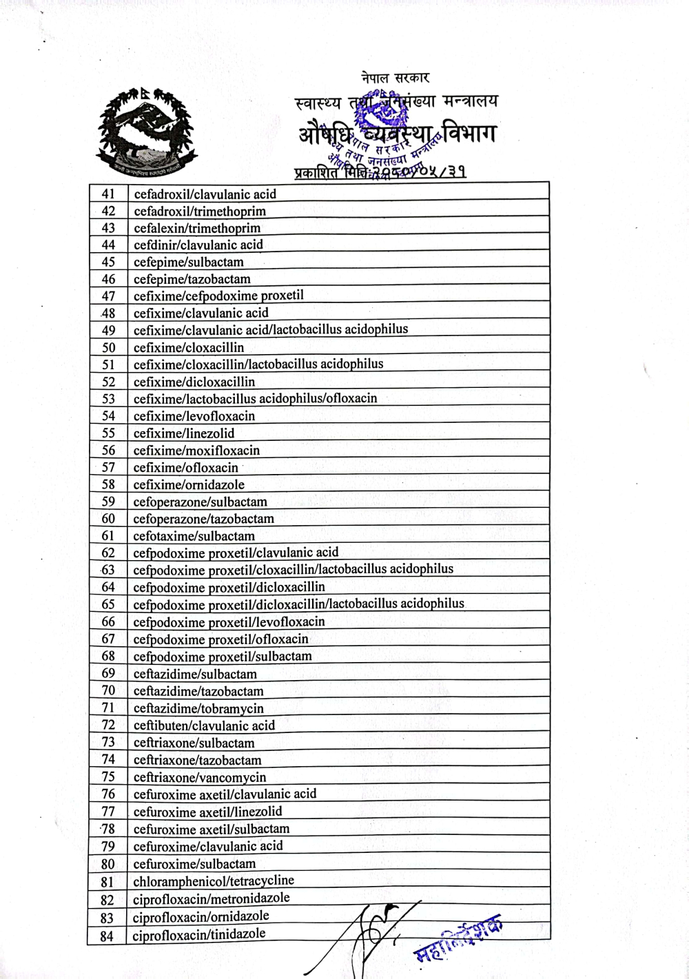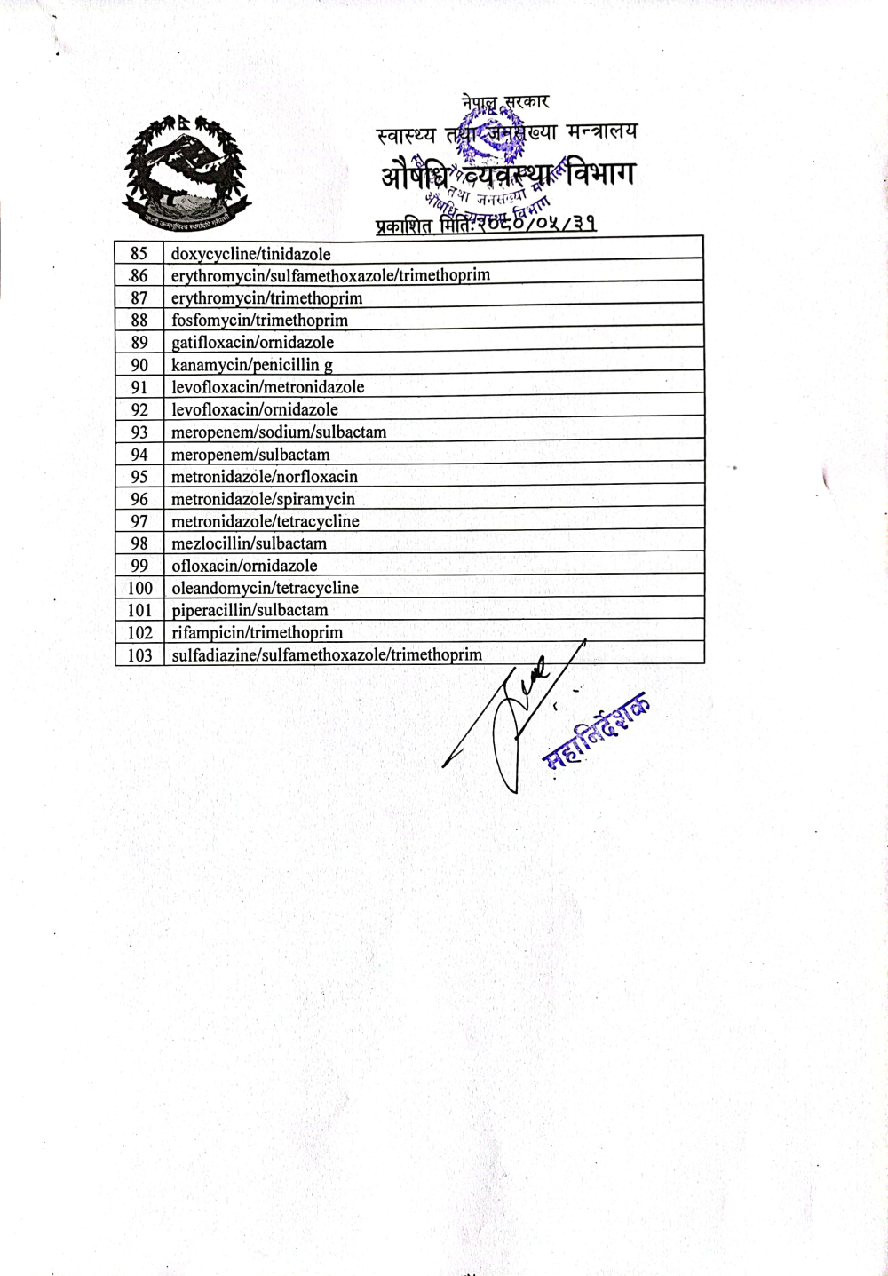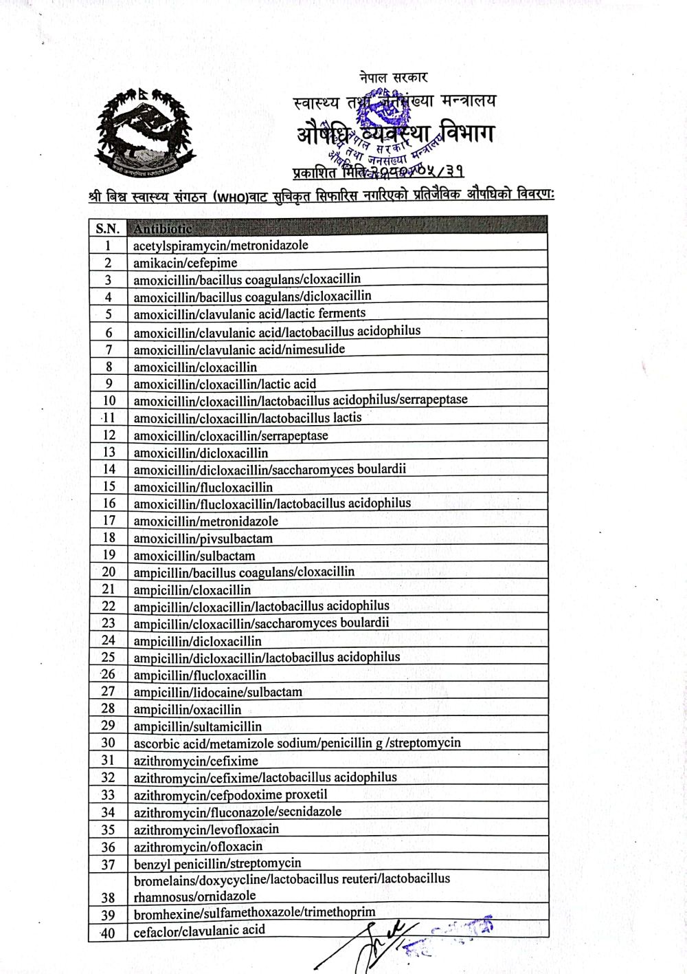 औषधि व्यवस्था विभागका महानिर्देशक नारायणप्रसाद ढकालले सूचना जारी गर्दै विश्व स्वास्थ्य संगठन (डब्लूएचओ)बाट सूचिकृत सिफारिस नगरिएका तर, नेपालमा प्रयोग हुँदै आएका एक सय तीन प्रकारका एन्टीबायोटिकको प्रयोग गर्न आग्रह गरेका हुन्।