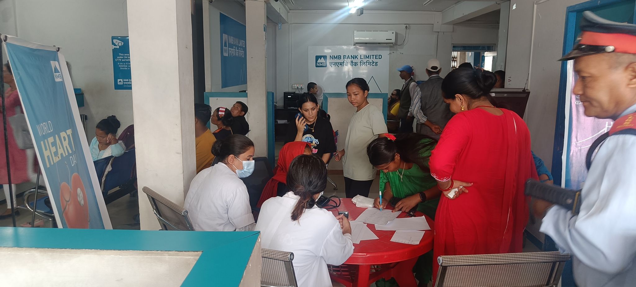 सुर्खेत । एनएमबी बैंक शाखा सुर्खेतले विश्व मुटु दिवशको अवसरमा बैकमा सेवा लिन आउने सेवाग्राहीलाई मुटुरोग सम्बन्धी एक दिने स्वास्थ्य शिविर सम्पन्न गरेको छ । मुटु प्रयोग गरौं, मुटु जानौं भन्ने मुल नाराको साथ सन २०२३ को विश्व मुटु दिवशको अवसर पारेर बैकले शिविरको आयोजना गरेको हो । एनएमबी बैंक शाखा सुर्खेतमा सेवा लिन आउने करिव एकसय ५० जना सेवा ग्राहीहरुको स्वास्थ्य परिक्षण गरेको बैकका विजिनेश डेप्लोमेन्ट म्यानेजर खगेन्द्र पाण्डेले जानकारी दिएका छन् ।