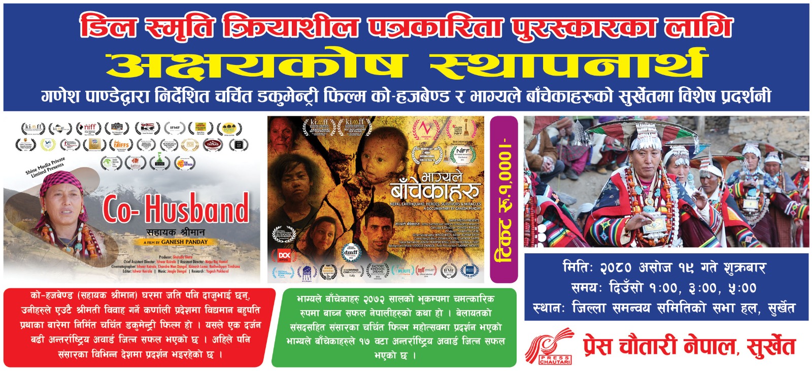 उक्त निर्णय अनुसार प्रेस चौतारी सुर्खेतले प्रेस चौतारी नेपालका उपाध्यक्ष गणेश पाण्डेद्वारा निर्देशित ‘को–हजबेण्ड र भाग्यले बाँचेकाहरू’ नामक चर्चित डकुमेन्ट्री फिल्म प्रदर्शनी गर्दै छ।