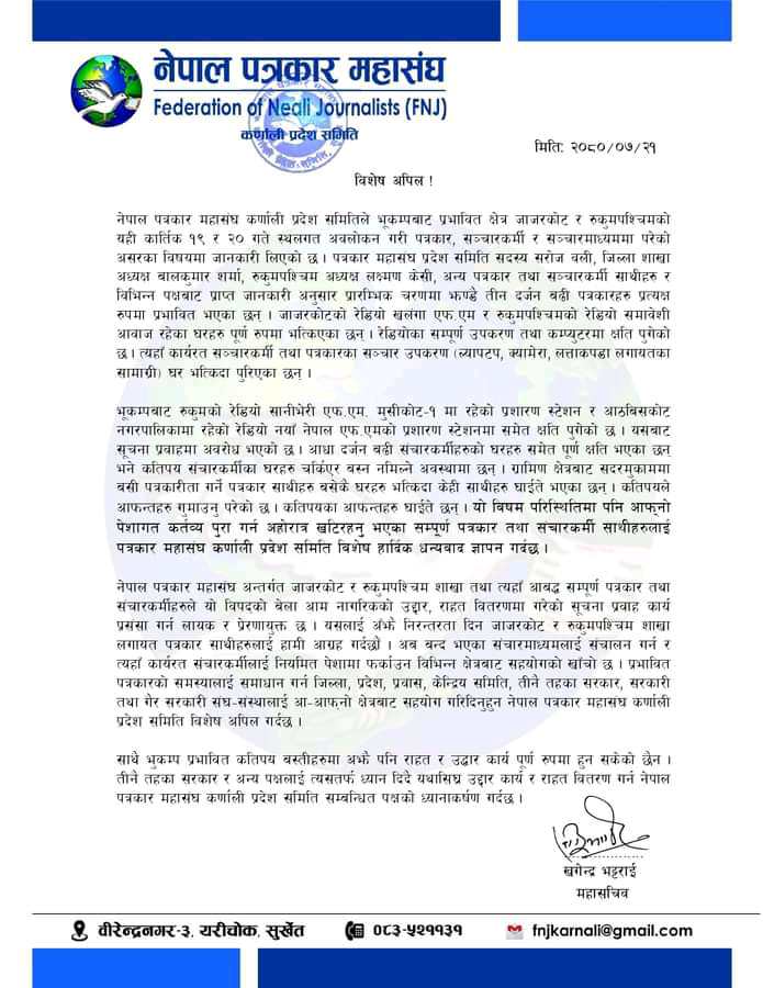 सुर्खेत । नेपाल पत्रकार महासंघ कर्णाली प्रदेश समितिले भूकम्प प्रभावित पत्रकार र संचारमाध्ययमलाई सहयोग गर्न अपिल गरेको छ। भूकम्पबाट प्रभावित क्षेत्र जाजरकोट र रुकुमपश्चिमको स्थलगत अवलोकनपछि अपिल पत्र सार्वजनिक गर्दै महासंघले भूकम्प प्रभावित पत्रकार र संचारमाध्ययमलाई सहयोग गर्न अनुरोध गरेको हो।