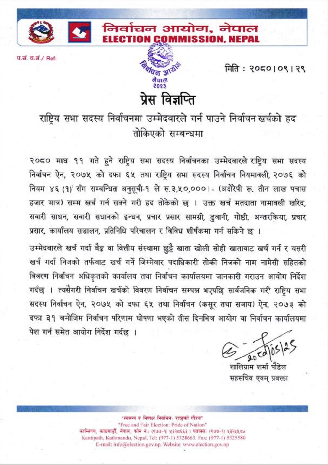 निर्वाचन आयोगले आइतबार एक सूचना जारी गर्दै उमेदवारले राष्ट्रियसभा सदस्य निर्वाचन ऐन, २०७५ को दफा ६५ तथा राष्ट्रियसभा सदस्य निर्वाचन नियमावली, २०७६ को नियम ४६ ९१० सँग सम्बन्धित अनुसूची–१ अनुसार खर्च गर्न पाउने जनाएको छ।
