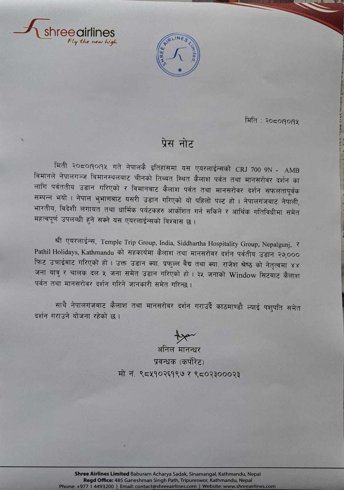 नेपाली भुभागबाट यसरी उडान गरिएको यो पहिलो पल्ट हो । नेपालगन्जबाट नेपाली, भारतीय, विदेशी लगायत तथा धार्मिक पर्यटकहरु आर्कर्षित गर्न सकिने र आर्थिक गतिविधीमा समेत महत्वपूर्ण उपलव्धी हुन सक्ने विश्वासका साथ उडान भरेको श्रीले जनाएको छ । श्री एयरलाईन्स, टेम्पल ट्रिप ग्रुप इन्डिया, सिद्धार्थ हस्पिटालिटी ग्रुप नेपालगन्ज, पाथिल होलिडे काठमाण्डौंको सहकार्यमा २७ हजार फिट माथिबाट कैलाश तथा मानसरोवर दर्शनका लागि उडान गरिएको हो ।