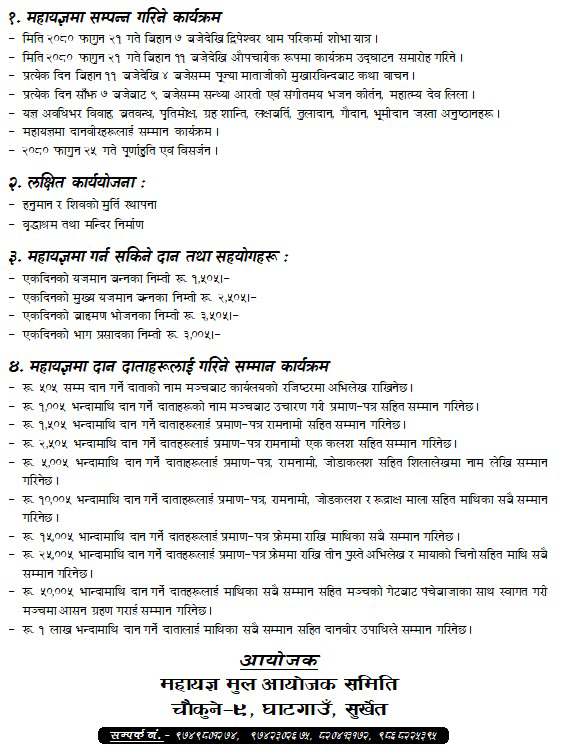 फागुन २५ गते पूर्णाहुति एवं विसर्जनसहित महोत्सव समापन गर्ने कार्यतालिका बनाएको अध्यक्ष खनालले जानकारी दिए ।