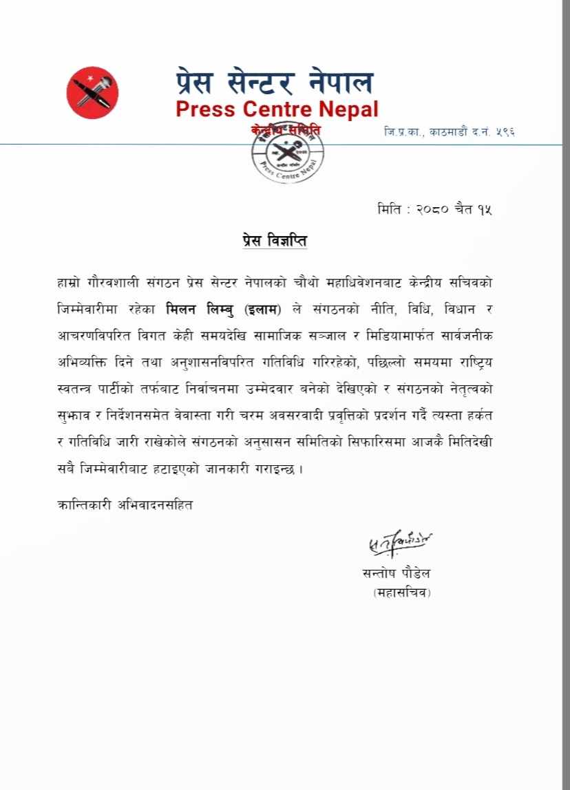 प्रेस सेन्टर नेपालको अनुशासन समितिको सिफारिसमा शुक्रबारदेखि सबै जिम्मेवारीबाट हटाइएको विज्ञप्तिमा उल्लेख छ।