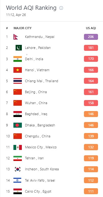 विश्वकै प्रदूषित दोस्रो सहरको सूचीमा पाकिस्तानको लाहोर छ भने तेस्रो स्थानमा भारतको राजधानी नयाँ दिल्ली छ। लाहोरको एक्यूआई आज १८१ छ भने दिल्लीको १७० छ।