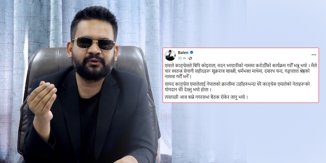 तीन घण्टा कुराएर बालेन आएनन्, फेसबुकबाटै नगरसभा बैठक स्थगित एसईईको नतिजामा सांसदहरू असन्तुष्ट, लगाए सरकारलाई दोष मदन–आश्रितको हत्यारा पत्ता लाग्छ : केपी ओली अझै पनि शिक्षालाई सर्वसुलभ र व्यवहारिक बनाउन सकेका छैनौँः सभामुख घिमिरे कर्णाली प्रदेश सरकारको प्रवक्तामा विनोद शाह बाढी, पहिरो र चट्याङबाट प्रभावित परिवारलाई राहत दिन माग कमल थापा नेतृत्वको राप्रपा नेपालले पशुपतिनजिकै अढाई तले घरमा सार्यो कार्यालय गृहमन्त्री लामिछानेलाई रामहरिले भने विपद्मा परेका नागरिकको पनि फाइल खोल्नुस् Posts pagination Previous 1 … 26 27 28 … 94 Next